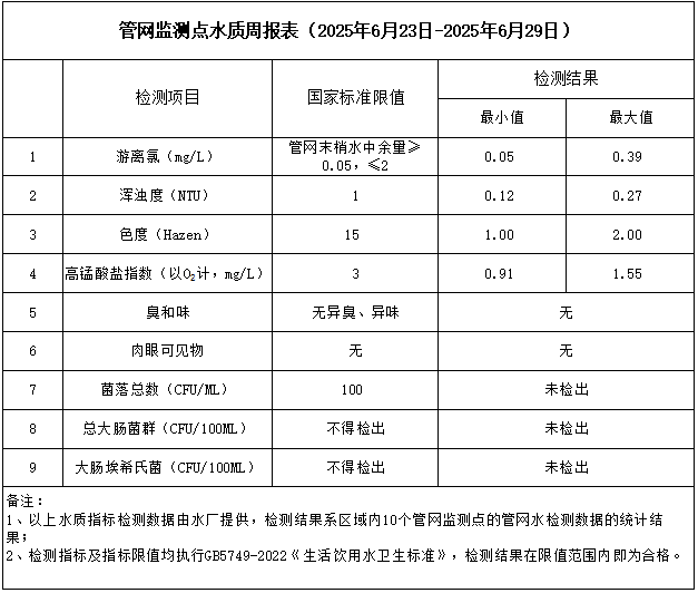 管網(wǎng)監(jiān)測點水質(zhì)周報表(2025年6月23日-2025年6月29日)