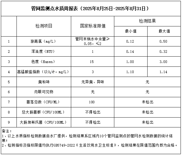 管網(wǎng)監(jiān)測點(diǎn)水質(zhì)周報表(2025年8月25日-2025年8月31日)