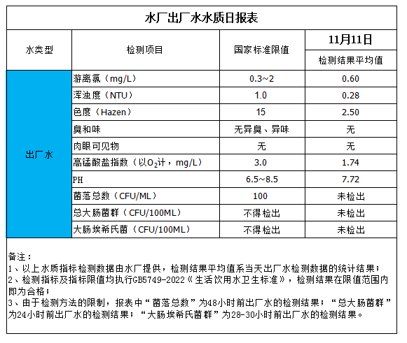 水廠出廠水水質(zhì)日?qǐng)?bào)表(2025-11-11)