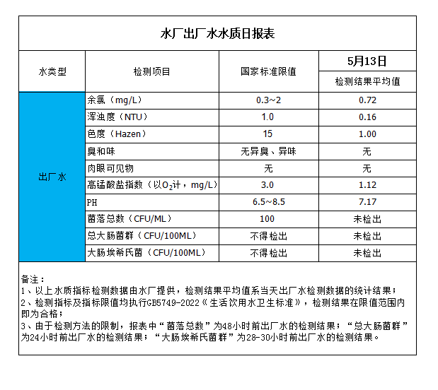 水廠出廠水水質(zhì)日?qǐng)?bào)表(2023-5-13)