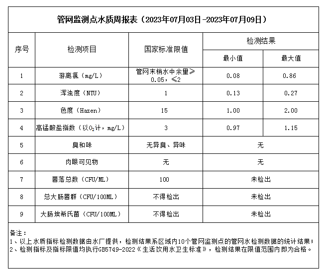 管網(wǎng)監(jiān)測(cè)點(diǎn)水質(zhì)周報(bào)表(2023年07月03日-2023年07月09日)