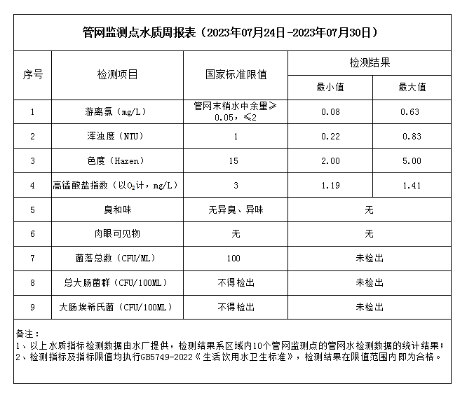 管網(wǎng)監(jiān)測(cè)點(diǎn)水質(zhì)周報(bào)表(2023年07月24日-2023年07月30日)