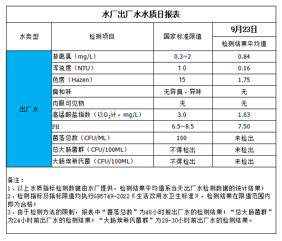 水廠出廠水水質(zhì)日?qǐng)?bào)表(2023-9-23)