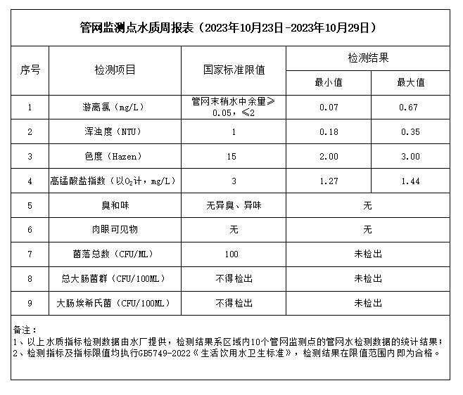 管網(wǎng)監(jiān)測(cè)點(diǎn)水質(zhì)周報(bào)表(2023年10月23日-2023年10月29日)