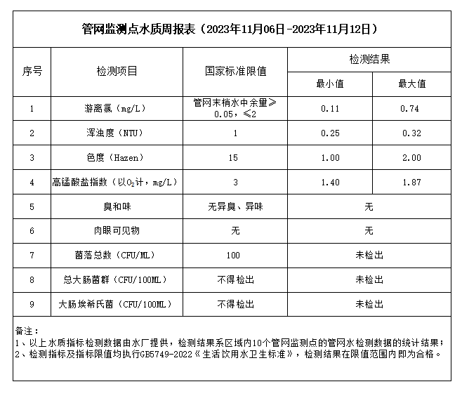 管網(wǎng)監(jiān)測(cè)點(diǎn)水質(zhì)周報(bào)表(2023年11月06日-2023年11月12日)