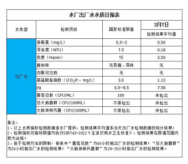 水廠出廠水水質(zhì)日報表(2024-3-7)