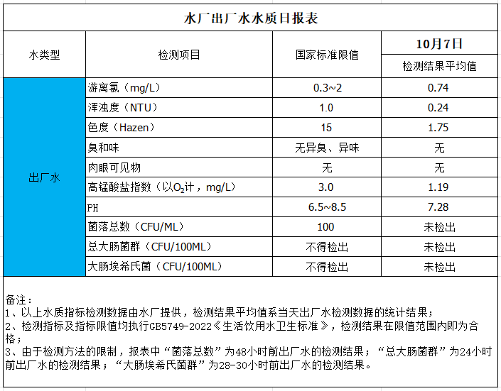 水廠出廠水水質(zhì)日報表(2024-10-7)