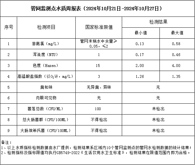管網(wǎng)監(jiān)測點(diǎn)水質(zhì)周報(bào)表(2024年10月21日-2024年10月27日)